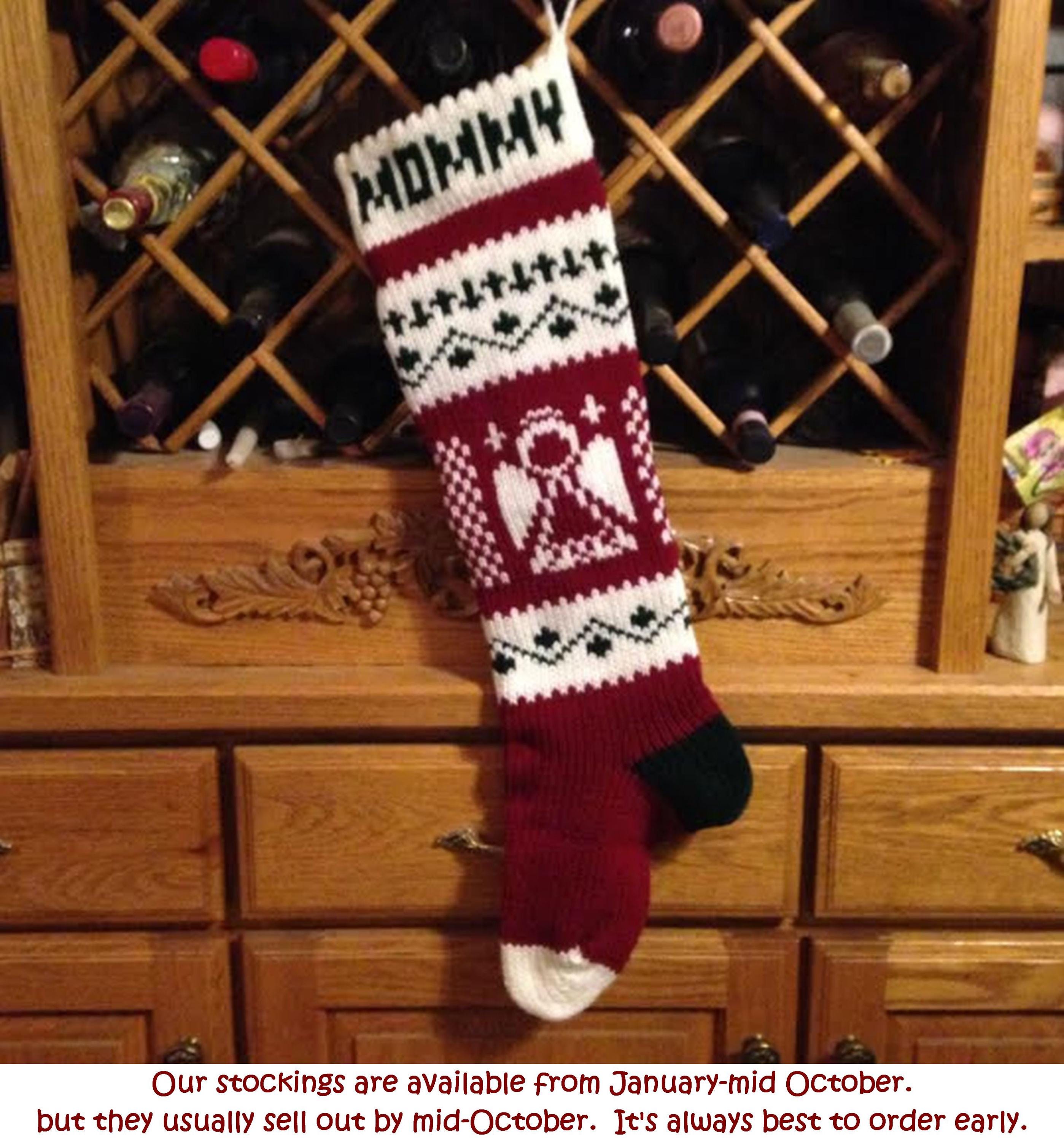 If your order requires special handling such as reversing direction of toe or reversing colors (ie green stocking instead of red) you must order by August 31. After that, we simply have no time to do special requests. Our stocking pattern is figured proportionally to the top width of the stocking. We are not able to alter the length or width so please make sure that a 30" stocking is what you want.